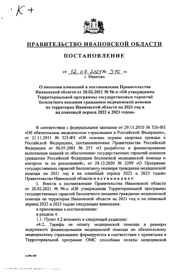 Постановление Правительства Ивановской области от 12.07.2021 N 316-п "О внесении изменений в постановление Правительства Ивановской области от 20.02.2021 N 96-п "Об утверждении Территориальной программы государственных гарантий бесплатного оказания гражданам медицинской помощи на территории Ивановской области на 2021 год и на плановый период 2022 и 2023 годов" (вместе с "Перечнем исследований и иных медицинских вмешательств, проводимых в рамках углубленной диспансеризации")