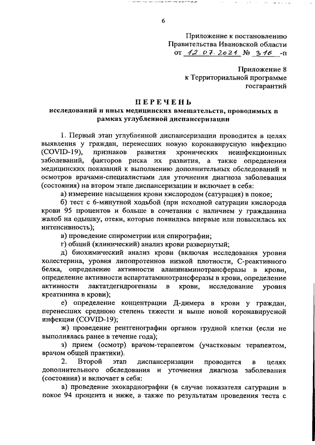 Постановление Правительства Ивановской области от 12.07.2021 N 316-п "О внесении изменений в постановление Правительства Ивановской области от 20.02.2021 N 96-п "Об утверждении Территориальной программы государственных гарантий бесплатного оказания гражданам медицинской помощи на территории Ивановской области на 2021 год и на плановый период 2022 и 2023 годов" (вместе с "Перечнем исследований и иных медицинских вмешательств, проводимых в рамках углубленной диспансеризации")