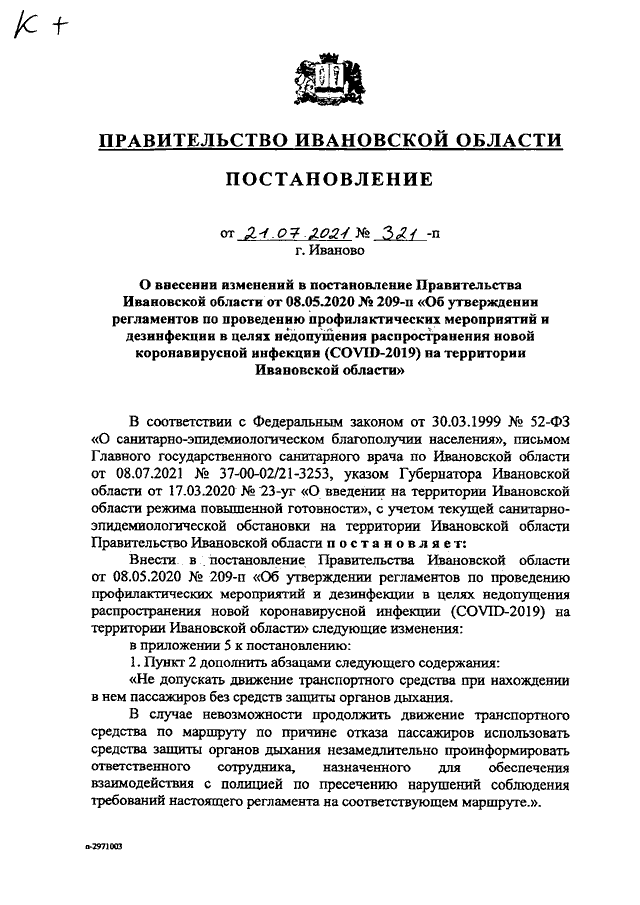 Постановление Правительства Ивановской области от 21.07.2021 N 321-п "О внесении изменений в постановление Правительства Ивановской области от 08.05.2020 N 209-п "Об утверждении регламентов по проведению профилактических мероприятий и дезинфекции в целях недопущения распространения новой коронавирусной инфекции (COVID-2019) на территории Ивановской области"