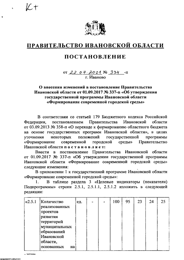 Постановление Правительства Ивановской области от 22.07.2021 N 334-п "О внесении изменений в постановление Правительства Ивановской области от 01.09.2017 N 337-п "Об утверждении государственной программы Ивановской области "Формирование современной городской среды" (вместе с "Адресным перечнем территорий, нуждающихся в благоустройстве и подлежащих благоустройству")