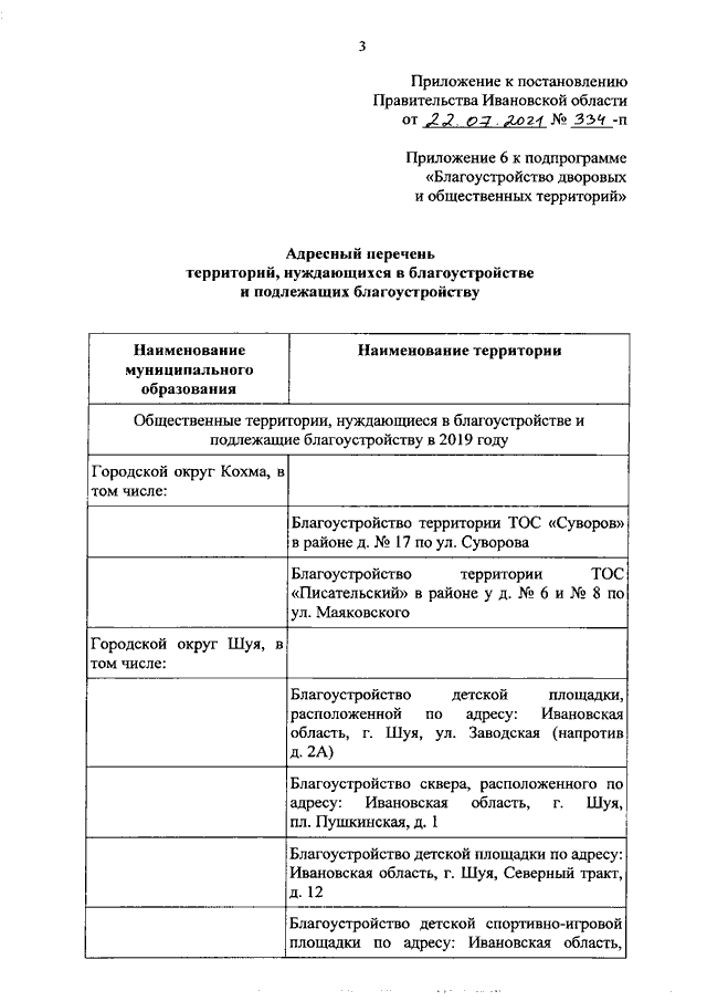 Постановление Правительства Ивановской области от 22.07.2021 N 334-п "О внесении изменений в постановление Правительства Ивановской области от 01.09.2017 N 337-п "Об утверждении государственной программы Ивановской области "Формирование современной городской среды" (вместе с "Адресным перечнем территорий, нуждающихся в благоустройстве и подлежащих благоустройству")