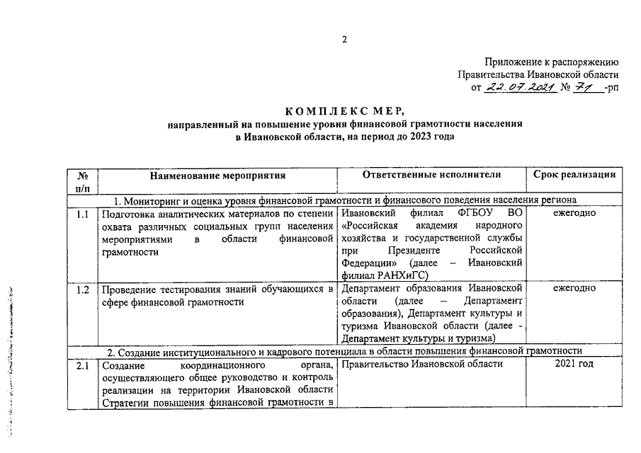 Распоряжение Правительства Ивановской области от 22.07.2021 N 71-рп "Об утверждении комплекса мер, направленного на повышение уровня финансовой грамотности населения в Ивановской области, на период до 2023 года"
