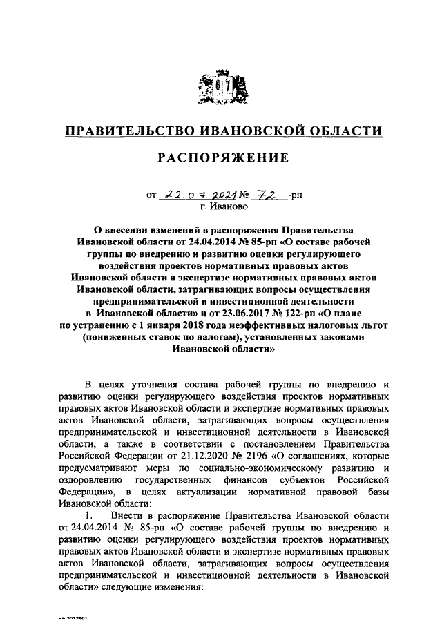 Распоряжение Правительства Ивановской области от 22.07.2021 N 72-рп "О внесении изменений в распоряжения Правительства Ивановской области от 24.04.2014 N 85-рп "О составе рабочей группы по внедрению и развитию оценки регулирующего воздействия проектов нормативных правовых актов Ивановской области и экспертизе нормативных правовых актов Ивановской области, затрагивающих вопросы осуществления предпринимательской и инвестиционной деятельности в Ивановской области" и от 23.06.2017 N 122-рп "О плане по устранению с 1 января 2018 года неэффективных налоговых льгот (пониженных ставок по налогам), установленных законами Ивановской области"