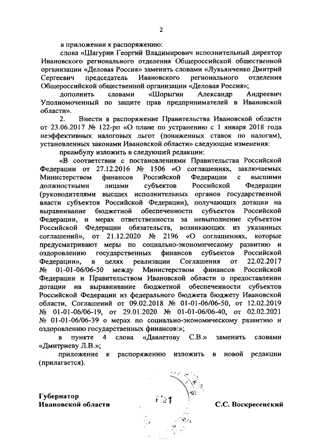 Распоряжение Правительства Ивановской области от 22.07.2021 N 72-рп "О внесении изменений в распоряжения Правительства Ивановской области от 24.04.2014 N 85-рп "О составе рабочей группы по внедрению и развитию оценки регулирующего воздействия проектов нормативных правовых актов Ивановской области и экспертизе нормативных правовых актов Ивановской области, затрагивающих вопросы осуществления предпринимательской и инвестиционной деятельности в Ивановской области" и от 23.06.2017 N 122-рп "О плане по устранению с 1 января 2018 года неэффективных налоговых льгот (пониженных ставок по налогам), установленных законами Ивановской области"