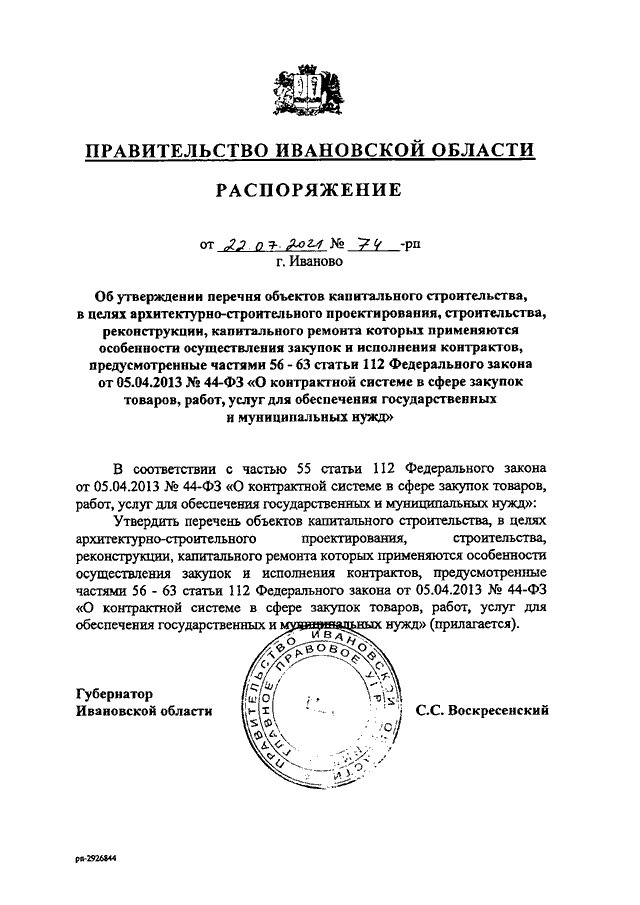 Распоряжение Правительства Ивановской области от 22.07.2021 N 74-рп "Об утверждении перечня объектов капитального строительства, в целях архитектурно-строительного проектирования, строительства, реконструкции, капитального ремонта которых применяются особенности осуществления закупок и исполнения контрактов, предусмотренные частями 56 - 63 статьи 112 Федерального закона от 05.04.2013 N 44-ФЗ "О контрактной системе в сфере закупок товаров, работ, услуг для обеспечения государственных и муниципальных нужд"