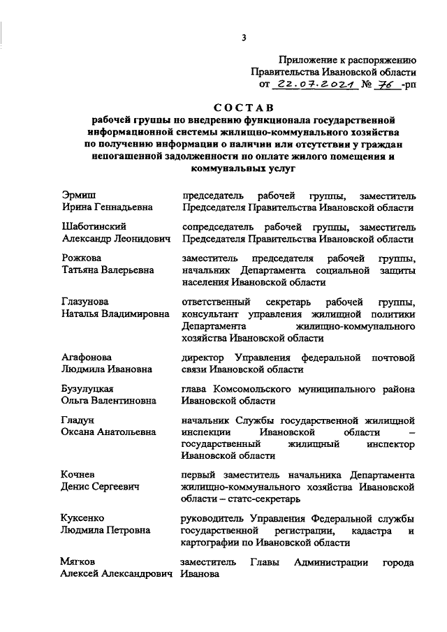 Распоряжение Правительства Ивановской области от 22.07.2021 N 76-рп "О создании рабочей группы по внедрению функционала государственной информационной системы жилищно-коммунального хозяйства по получению информации о наличии или отсутствии у граждан непогашенной задолженности по оплате жилого помещения и коммунальных услуг"