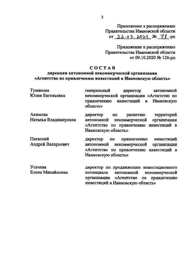 Распоряжение Правительства Ивановской области от 22.07.2021 N 78-рп "О внесении изменения в распоряжение Правительства Ивановской области от 09.10.2020 N 126-рп "Об утверждении состава дирекции автономной некоммерческой организации "Агентство по привлечению инвестиций в Ивановскую область" и о внесении изменений в распоряжение Правительства Ивановской области от 21.12.2017 N 226-рп "О создании наблюдательного совета автономной некоммерческой организации "Агентство по привлечению инвестиций в Ивановскую область"
