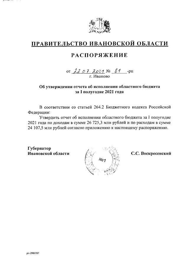 Распоряжение Правительства Ивановской области от 22.07.2021 N 81-рп "Об утверждении отчета об исполнении областного бюджета за I полугодие 2021 года"