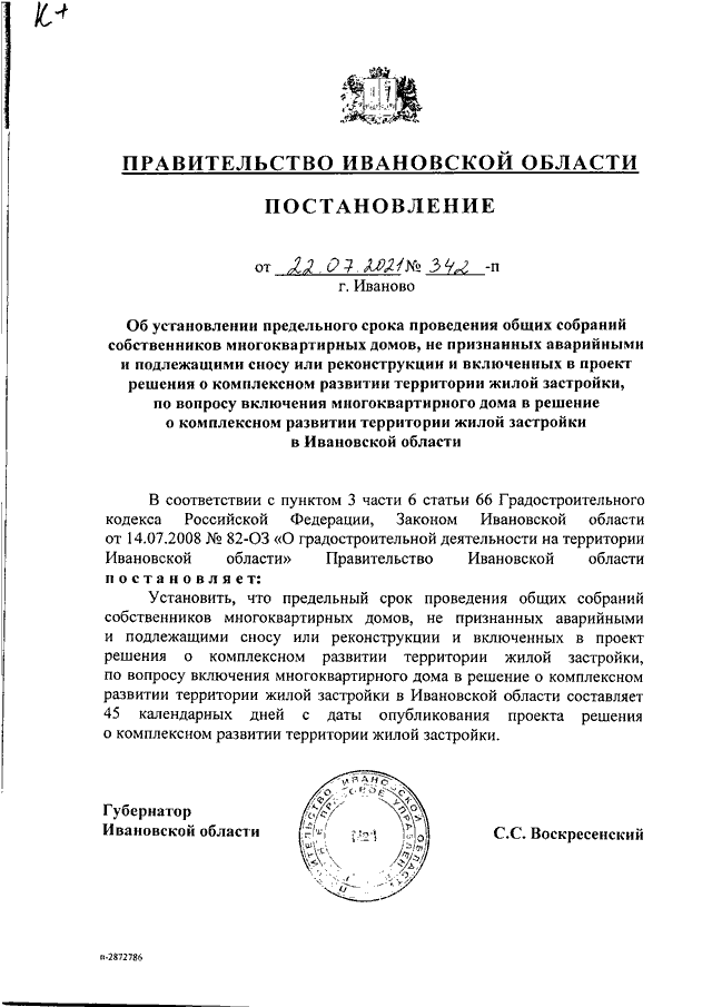 Постановление Правительства Ивановской области от 22.07.2021 N 342-п "Об установлении предельного срока проведения общих собраний собственников многоквартирных домов, не признанных аварийными и подлежащими сносу или реконструкции и включенных в проект решения о комплексном развитии территории жилой застройки, по вопросу включения многоквартирного дома в решение о комплексном развитии территории жилой застройки в Ивановской области"