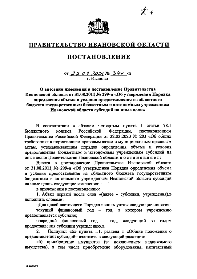 Постановление Правительства Ивановской области от 22.07.2021 N 341-п "О внесении изменений в постановление Правительства Ивановской области от 31.08.2011 N 299-п "Об утверждении Порядка определения объема и условия предоставления из областного бюджета государственным бюджетным и автономным учреждениям Ивановской области субсидий на иные цели"