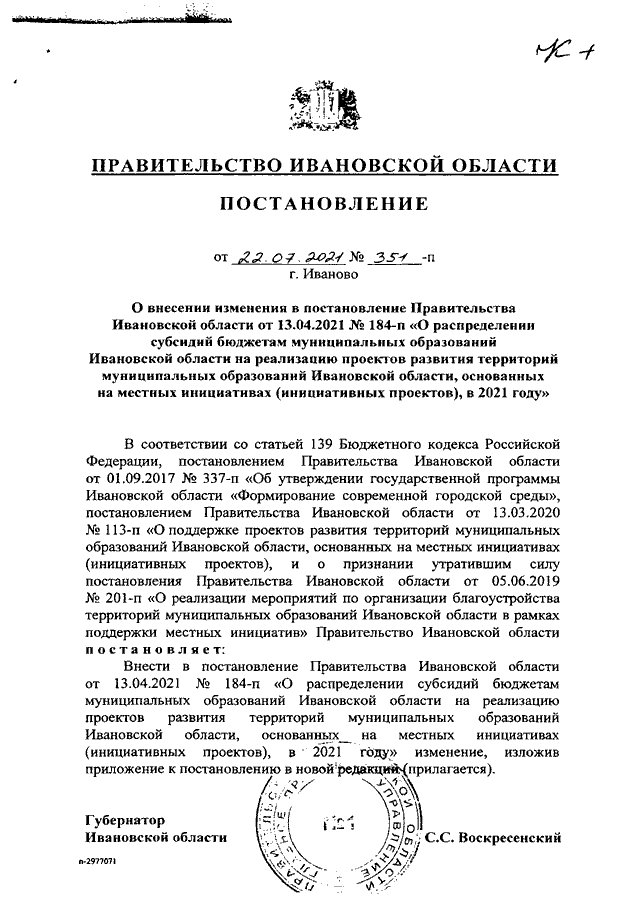Постановление Правительства Ивановской области от 22.07.2021 N 351-п "О внесении изменения в постановление Правительства Ивановской области от 13.04.2021 N 184-п "О распределении субсидий бюджетам муниципальных образований Ивановской области на реализацию проектов развития территорий муниципальных образований Ивановской области, основанных на местных инициативах (инициативных проектов), в 2021 году"