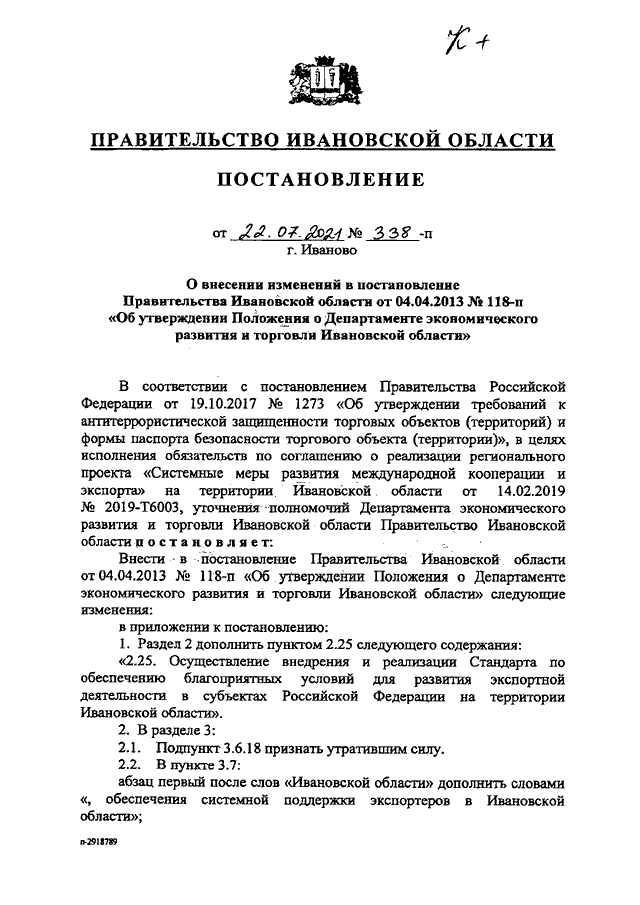 Постановление Правительства Ивановской области от 22.07.2021 N 338-п "О внесении изменений в постановление Правительства Ивановской области от 04.04.2013 N 118-п "Об утверждении Положения о Департаменте экономического развития и торговли Ивановской области"