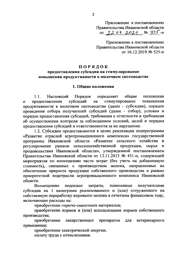 Постановление Правительства Ивановской области от 22.07.2021 N 335-п "О внесении изменения в постановление Правительства Ивановской области от 16.12.2019 N 525-п "Об утверждении Порядка предоставления субсидии на стимулирование повышения продуктивности в молочном скотоводстве"