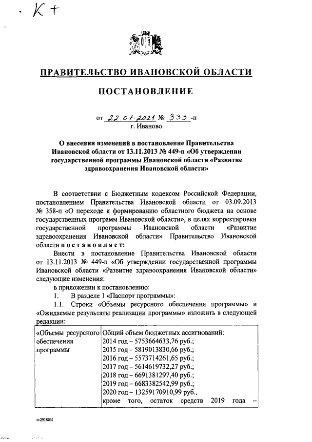 Постановление Правительства Ивановской области от 22.07.2021 N 333-п "О внесении изменений в постановление Правительства Ивановской области от 13.11.2013 N 449-п "Об утверждении государственной программы Ивановской области "Развитие здравоохранения Ивановской области"