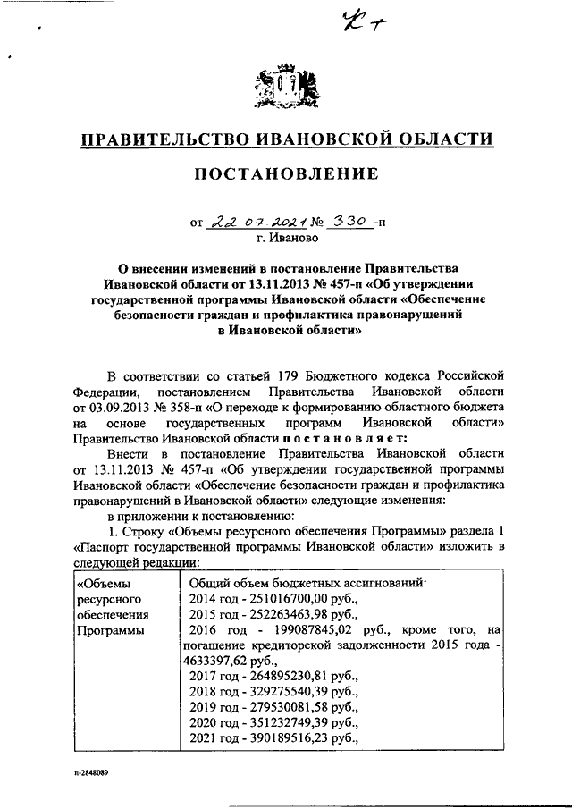 Постановление Правительства Ивановской области от 22.07.2021 N 330-п "О внесении изменений в постановление Правительства Ивановской области от 13.11.2013 N 457-п "Об утверждении государственной программы Ивановской области "Обеспечение безопасности граждан и профилактика правонарушений в Ивановской области"