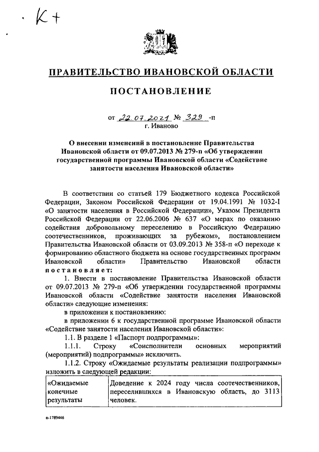 Постановление Правительства Ивановской области от 22.07.2021 N 329-п "О внесении изменений в постановление Правительства Ивановской области от 09.07.2013 N 279-п "Об утверждении государственной программы Ивановской области "Содействие занятости населения Ивановской области"