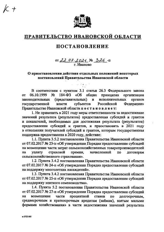 Постановление Правительства Ивановской области от 22.07.2021 N 326-п "О приостановлении действия отдельных положений некоторых постановлений Правительства Ивановской области"