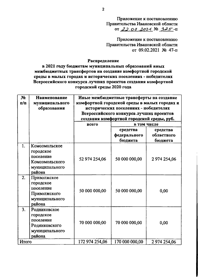 Постановление Правительства Ивановской области от 22.07.2021 N 325-п "О внесении изменения в постановление Правительства Ивановской области от 09.02.2021 N 47-п "О распределении в 2021 году бюджетам муниципальных образований иных межбюджетных трансфертов на создание комфортной городской среды в малых городах и исторических поселениях - победителях Всероссийского конкурса лучших проектов создания комфортной городской среды 2020 года"
