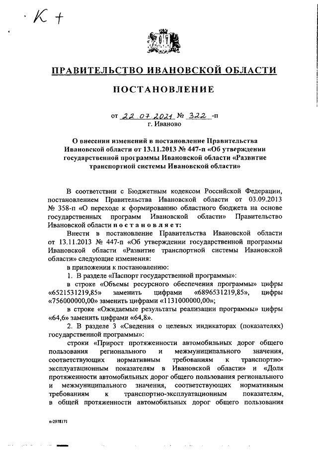 Постановление Правительства Ивановской области от 22.07.2021 N 322-п "О внесении изменений в постановление Правительства Ивановской области от 13.11.2013 N 447-п "Об утверждении государственной программы Ивановской области "Развитие транспортной системы Ивановской области"
