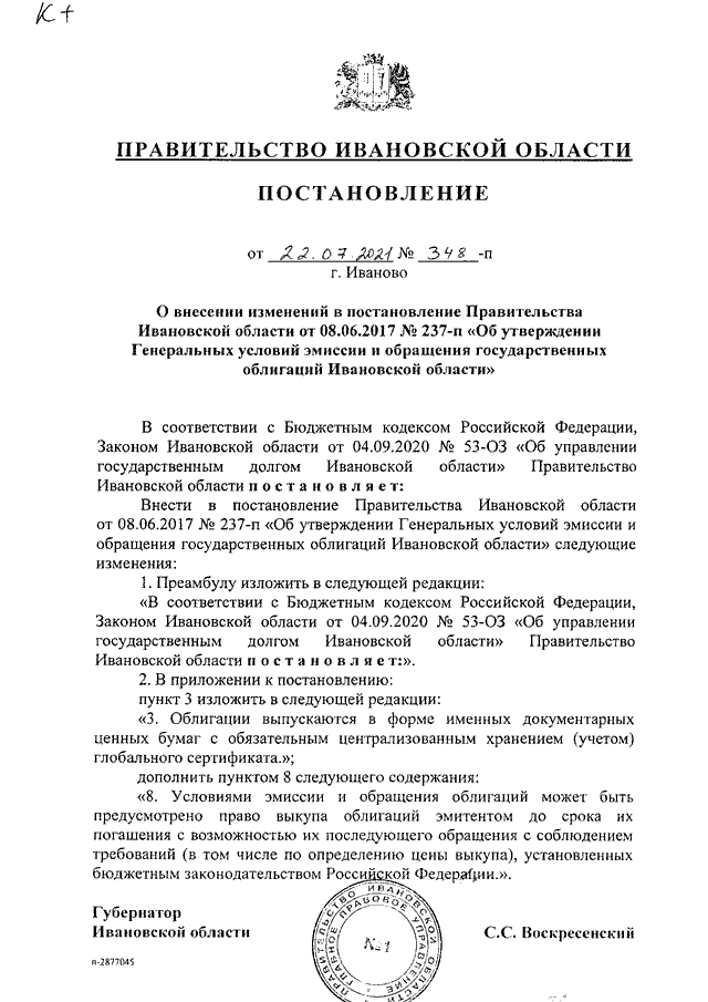 Постановление Правительства Ивановской области от 22.07.2021 N 348-п "О внесении изменений в постановление Правительства Ивановской области от 08.06.2017 N 237-п "Об утверждении Генеральных условий эмиссии и обращения государственных облигаций Ивановской области"