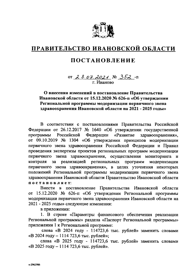 Постановление Правительства Ивановской области от 28.07.2021 N 352-п "О внесении изменений в постановление Правительства Ивановской области от 15.12.2020 N 626-п "Об утверждении Региональной программы модернизации первичного звена здравоохранения Ивановской области на 2021 - 2025 годы" (вместе с "Планом мероприятий "дорожная карта" по реализации региональной программы")