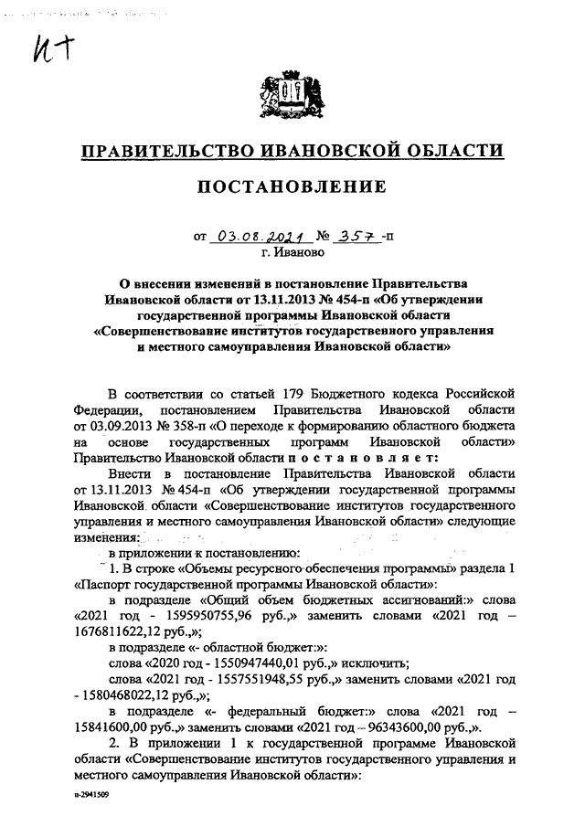 Постановление Правительства Ивановской области от 03.08.2021 N 357-п "О внесении изменений в постановление Правительства Ивановской области от 13.11.2013 N 454-п "Об утверждении государственной программы Ивановской области "Совершенствование институтов государственного управления и местного самоуправления Ивановской области"
