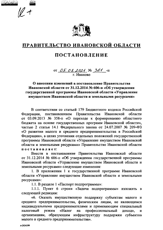 Постановление Правительства Ивановской области от 05.08.2021 N 361-п "О внесении изменений в постановление Правительства Ивановской области от 31.12.2014 N 606-п "Об утверждении государственной программы Ивановской области "Управление имуществом Ивановской области и земельными ресурсами"