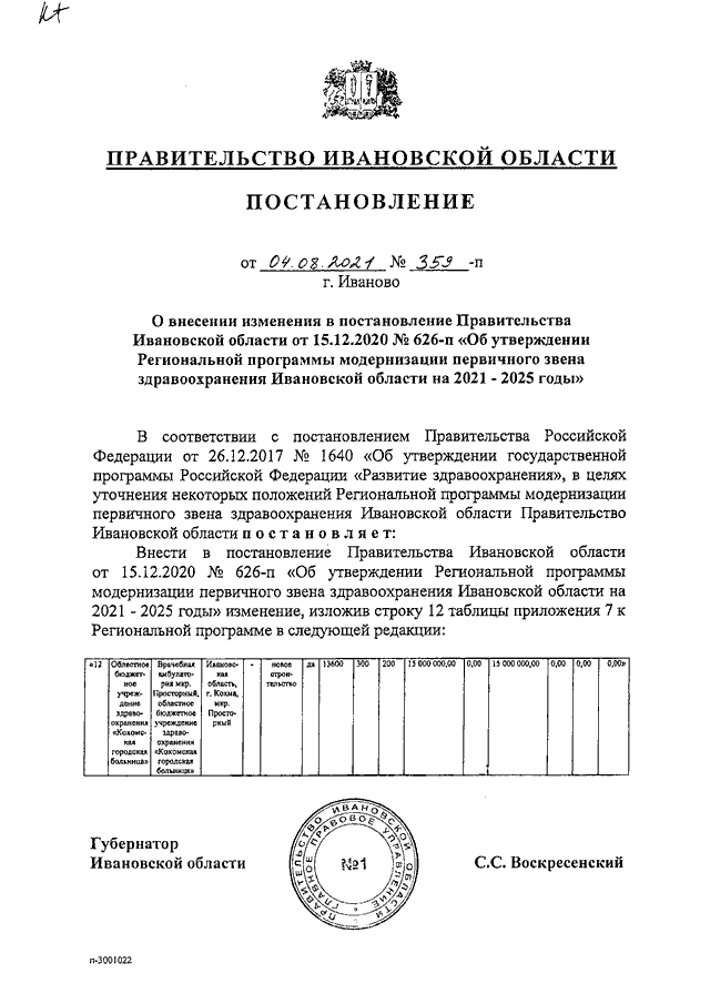 Постановление Правительства Ивановской области от 04.08.2021 N 359-п "О внесении изменения в постановление Правительства Ивановской области от 15.12.2020 N 626-п "Об утверждении Региональной программы модернизации первичного звена здравоохранения Ивановской области на 2021 - 2025 годы"