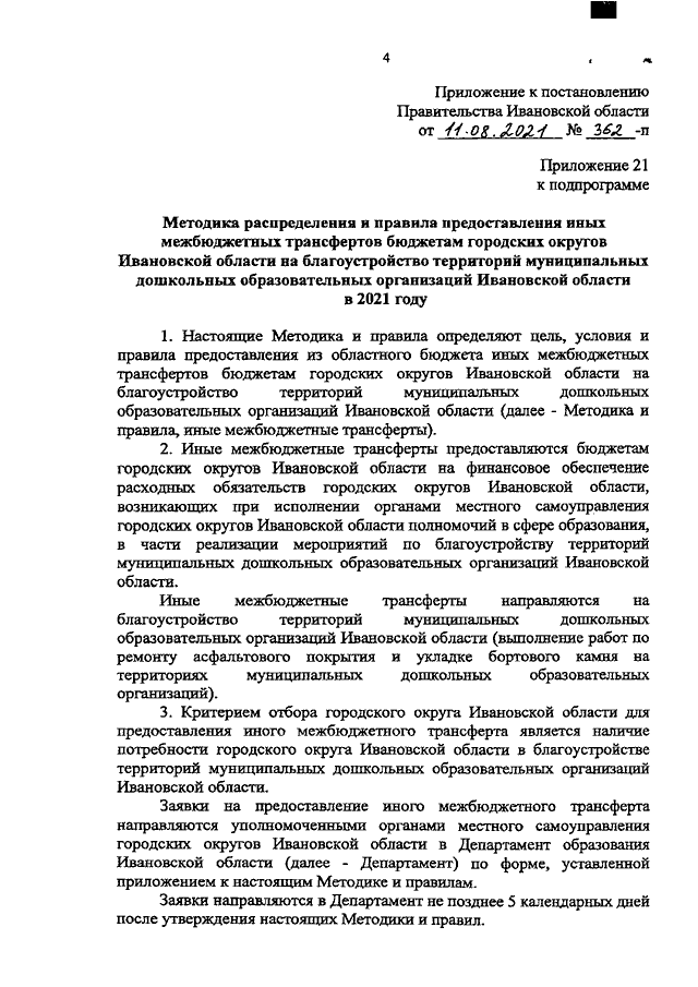 Постановление Правительства Ивановской области от 11.08.2021 N 362-п "О внесении изменений в постановление Правительства Ивановской области от 13.11.2013 N 450-п "Об утверждении государственной программы "Развитие образования Ивановской области" (вместе с "Методикой распределения и правилами предоставления иных межбюджетных трансфертов бюджетам городских округов Ивановской области на благоустройство территорий муниципальных дошкольных образовательных организаций Ивановской области в 2021 году")
