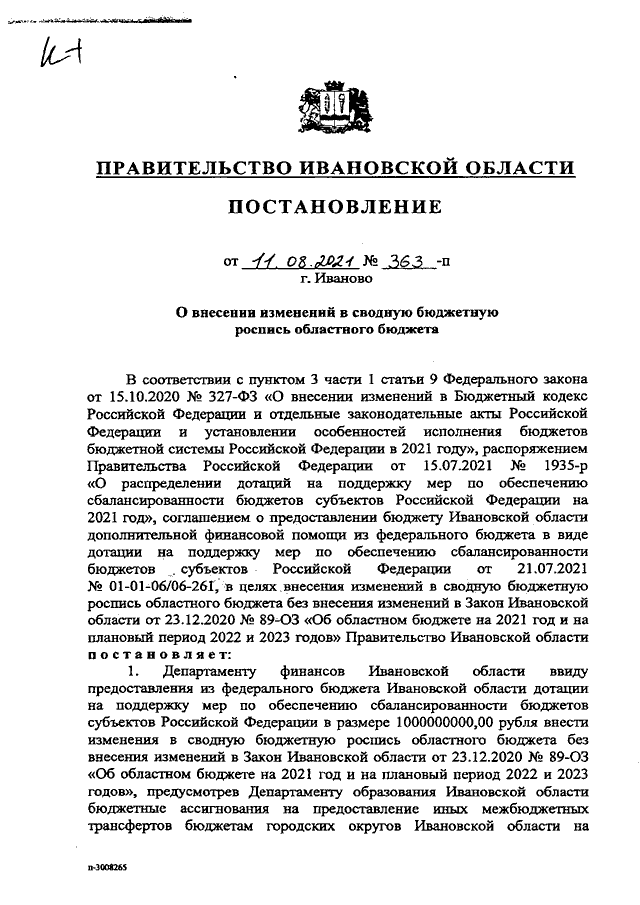 Постановление Правительства Ивановской области от 11.08.2021 N 363-п "О внесении изменений в сводную бюджетную роспись областного бюджета"
