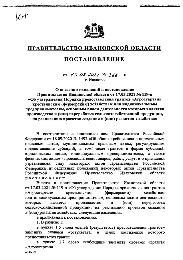 Постановление Правительства Ивановской области от 13.08.2021 N 366-п "О внесении изменений в постановление Правительства Ивановской области от 17.03.2021 N 119-п "Об утверждении Порядка предоставления грантов "Агростартап" крестьянским (фермерским) хозяйствам или индивидуальным предпринимателям, основным видом деятельности которых является производство и (или) переработка сельскохозяйственной продукции, на реализацию проектов создания и (или) развития хозяйства"