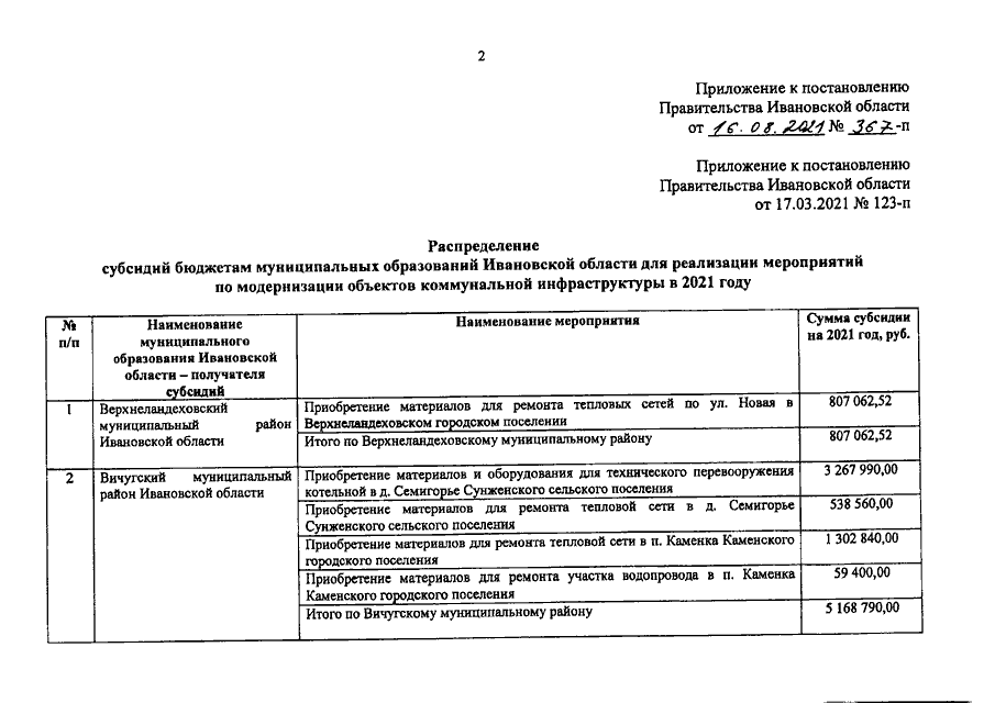 Постановление Правительства Ивановской области от 16.08.2021 N 367-п "О внесении изменения в постановление Правительства Ивановской области от 17.03.2021 N 123-п "О распределении субсидий бюджетам муниципальных образований Ивановской области для реализации мероприятий по модернизации объектов коммунальной инфраструктуры в 2021 году"