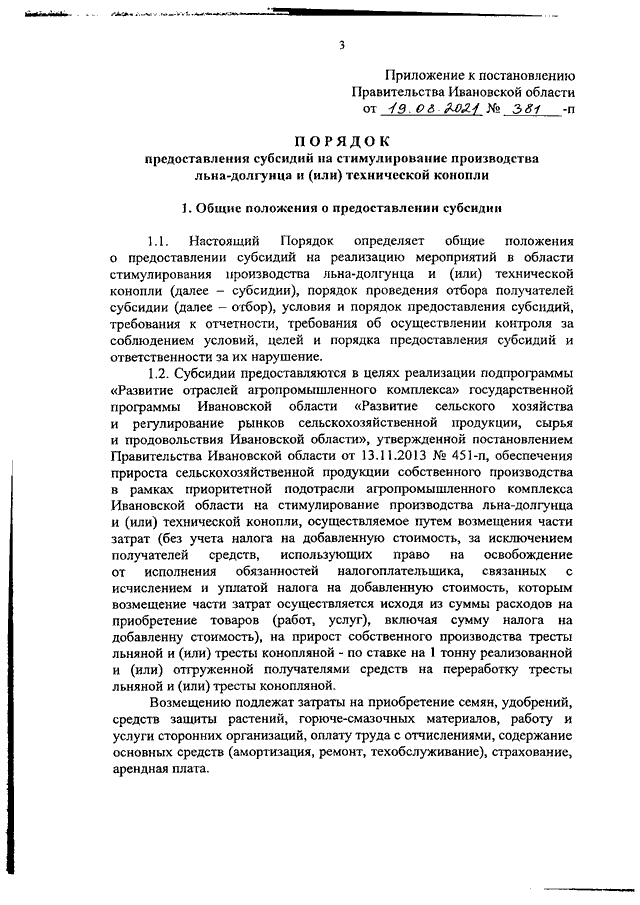 Постановление Правительства Ивановской области от 19.08.2021 N 381-п "Об утверждении Порядка предоставления субсидий на стимулирование производства льна-долгунца и (или) технической конопли"
