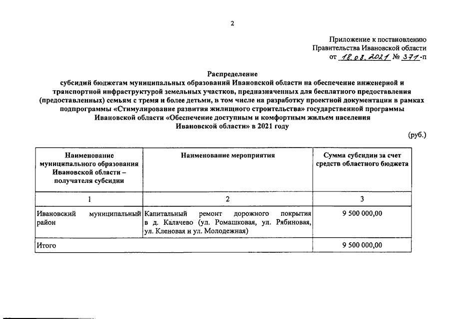 Постановление Правительства Ивановской области от 18.08.2021 N 371-п "О распределении субсидий бюджетам муниципальных образований Ивановской области на обеспечение инженерной и транспортной инфраструктурой земельных участков, предназначенных для бесплатного предоставления (предоставленных) семьям с тремя и более детьми, в том числе на разработку проектной документации в рамках подпрограммы "Стимулирование развития жилищного строительства" государственной программы Ивановской области "Обеспечение доступным и комфортным жильем населения Ивановской области" в 2021 году"