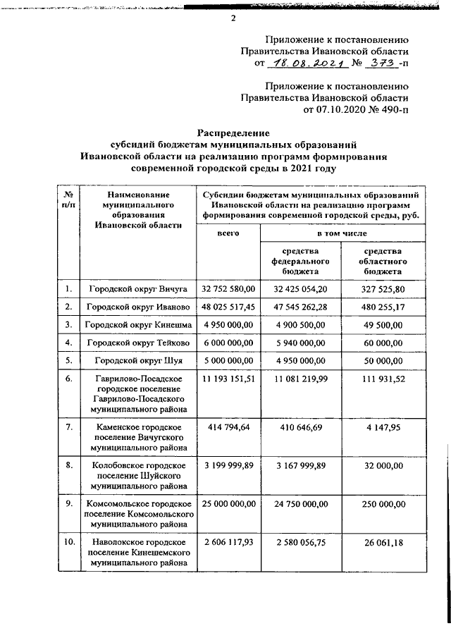 Постановление Правительства Ивановской области от 18.08.2021 N 373-п "О внесении изменения в постановление Правительства Ивановской области от 07.10.2020 N 490-п "О распределении субсидий бюджетам муниципальных образований на реализацию программ формирования современной городской среды в 2021 году"