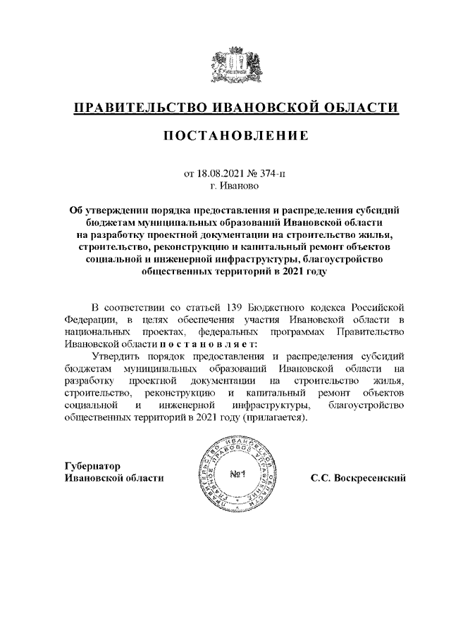 Постановление Правительства Ивановской области от 18.08.2021 N 374-п "Об утверждении порядка предоставления и распределения субсидий бюджетам муниципальных образований Ивановской области на разработку проектной документации на строительство жилья, строительство, реконструкцию и капитальный ремонт объектов социальной и инженерной инфраструктуры, благоустройство общественных территорий в 2021 году"