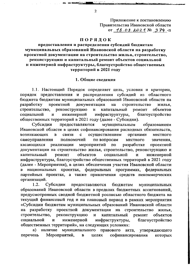 Постановление Правительства Ивановской области от 18.08.2021 N 374-п "Об утверждении порядка предоставления и распределения субсидий бюджетам муниципальных образований Ивановской области на разработку проектной документации на строительство жилья, строительство, реконструкцию и капитальный ремонт объектов социальной и инженерной инфраструктуры, благоустройство общественных территорий в 2021 году"