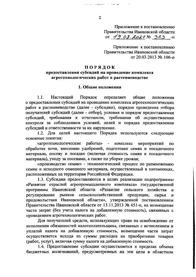 Постановление Правительства Ивановской области от 19.08.2021 N 383-п "О внесении изменения в постановление Правительства Ивановской области от 20.03.2013 N 106-п "Об утверждении Порядка предоставления субсидий на проведение комплекса агротехнологических работ в растениеводстве"