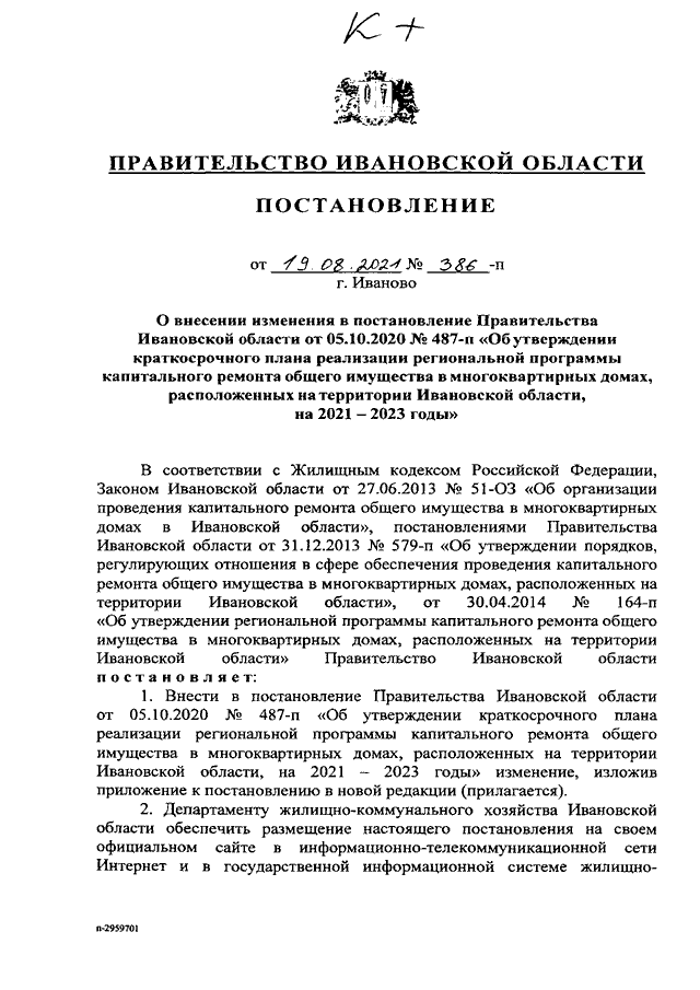 Постановление Правительства Ивановской области от 19.08.2021 N 386-п "О внесении изменения в постановление Правительства Ивановской области от 05.10.2020 N 487-п "Об утверждении краткосрочного плана реализации региональной программы капитального ремонта общего имущества в многоквартирных домах, расположенных на территории Ивановской области, на 2021 - 2023 годы"