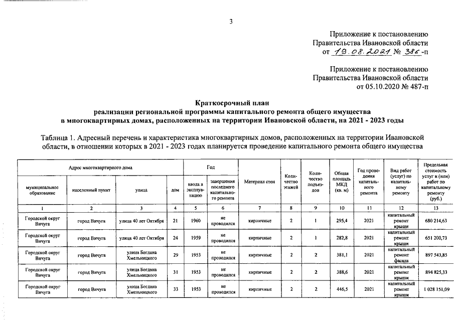 Постановление Правительства Ивановской области от 19.08.2021 N 386-п "О внесении изменения в постановление Правительства Ивановской области от 05.10.2020 N 487-п "Об утверждении краткосрочного плана реализации региональной программы капитального ремонта общего имущества в многоквартирных домах, расположенных на территории Ивановской области, на 2021 - 2023 годы"