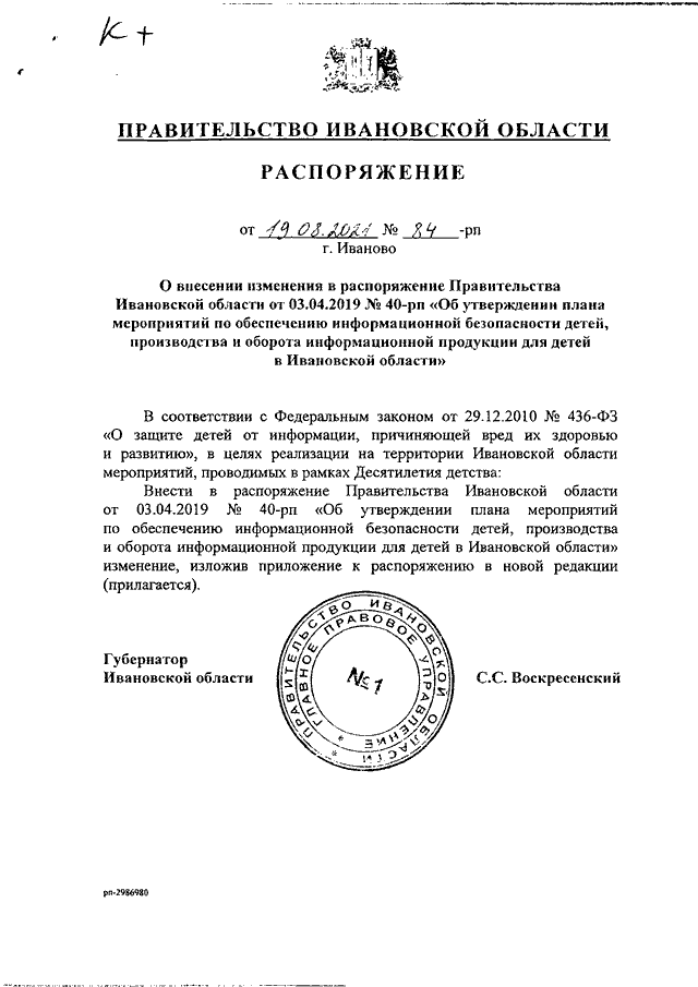 Распоряжение Правительства Ивановской области от 19.08.2021 N 84-рп "О внесении изменения в распоряжение Правительства Ивановской области от 03.04.2019 N 40-рп "Об утверждении плана мероприятий по обеспечению информационной безопасности детей, производства и оборота информационной продукции для детей в Ивановской области"