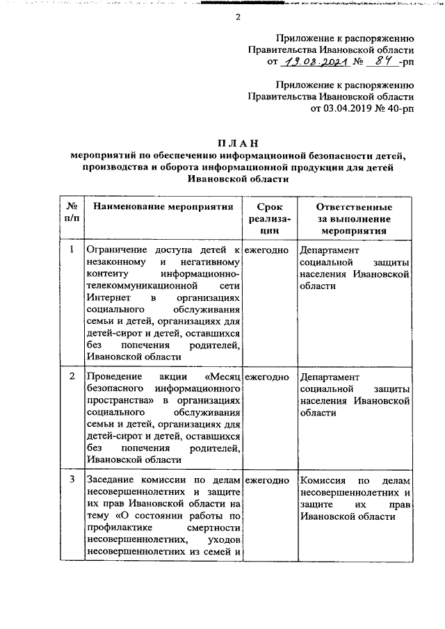 Распоряжение Правительства Ивановской области от 19.08.2021 N 84-рп "О внесении изменения в распоряжение Правительства Ивановской области от 03.04.2019 N 40-рп "Об утверждении плана мероприятий по обеспечению информационной безопасности детей, производства и оборота информационной продукции для детей в Ивановской области"