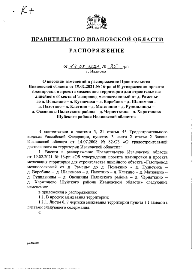 Распоряжение Правительства Ивановской области от 19.08.2021 N 85-рп "О внесении изменений в распоряжение Правительства Ивановской области от 19.02.2021 N 16-рп "Об утверждении проекта планировки и проекта межевания территории для строительства линейного объекта "Газопровод межпоселковый от д. Раменье до д. Понькино - д. Кузнечиха - д. Воробино - д. Шалимово - д. Пахотино - д. Клетино - д. Матюкино - д. Рудильницы - д. Овсяницы Палехского района - д. Черняткино - д. Харитоново Шуйского района Ивановской области"
