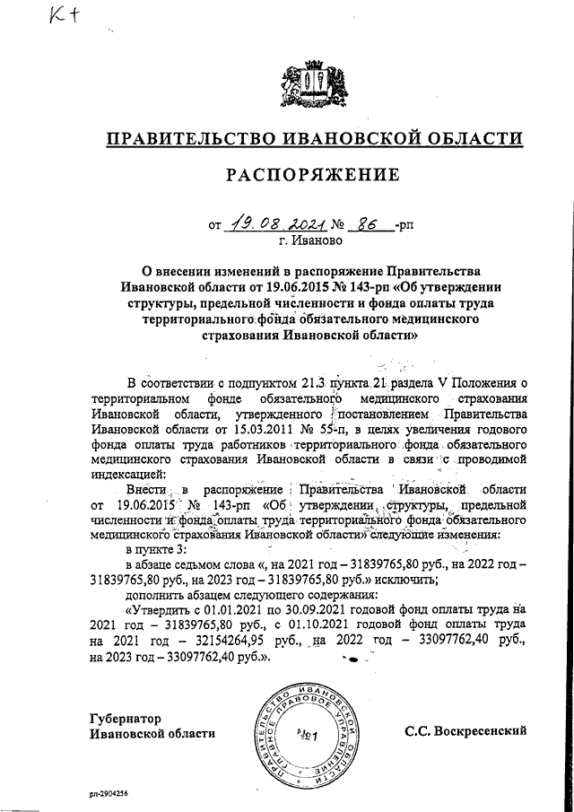 Распоряжение Правительства Ивановской области от 19.08.2021 N 86-рп "О внесении изменений в распоряжение Правительства Ивановской области от 19.06.2015 N 143-рп "Об утверждении структуры, предельной численности и фонда оплаты труда территориального фонда обязательного медицинского страхования Ивановской области"