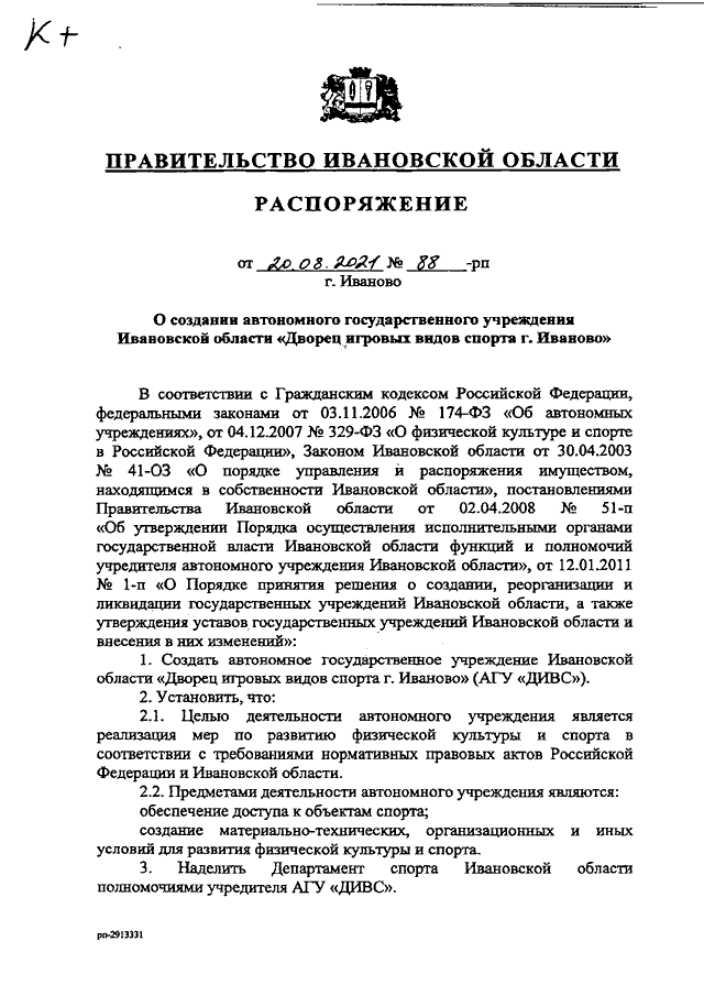 Распоряжение Правительства Ивановской области от 20.08.2021 N 88-рп "О создании автономного государственного учреждения Ивановской области "Дворец игровых видов спорта г. Иваново"
