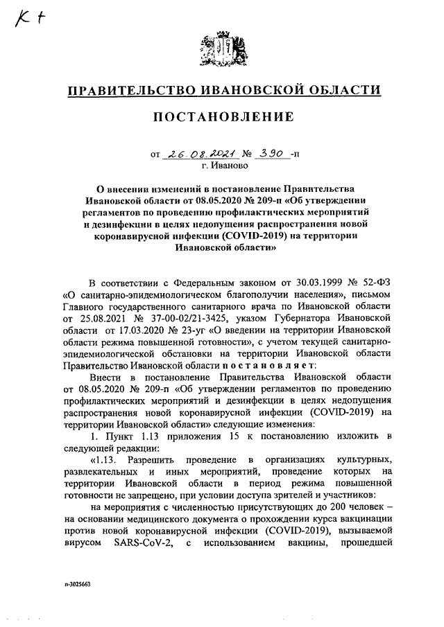 Постановление Правительства Ивановской области от 26.08.2021 N 390-п "О внесении изменений в постановление Правительства Ивановской области от 08.05.2020 N 209-п "Об утверждении регламентов по проведению профилактических мероприятий и дезинфекции в целях недопущения распространения новой коронавирусной инфекции (COVID-2019) на территории Ивановской области"