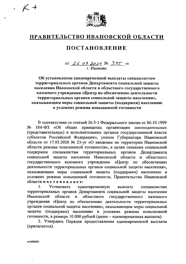 Постановление Правительства Ивановской области от 26.08.2021 N 395-п "Об установлении единовременной выплаты специалистам территориальных органов Департамента социальной защиты населения Ивановской области и областного государственного казенного учреждения "Центр по обеспечению деятельности территориальных органов социальной защиты населения", оказывающим меры социальной защиты (поддержки) населению в условиях режима повышенной готовности" (вместе с "Порядком предоставления единовременной выплаты специалистам территориальных органов Департамента социальной защиты населения Ивановской области и областного государственного казенного учреждения "Центр по обеспечению деятельности территориальных органов социальной защиты населения", оказывающим меры социальной защиты (поддержки) населению в условиях режима повышенной готовности")
