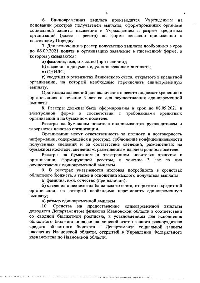 Постановление Правительства Ивановской области от 26.08.2021 N 395-п "Об установлении единовременной выплаты специалистам территориальных органов Департамента социальной защиты населения Ивановской области и областного государственного казенного учреждения "Центр по обеспечению деятельности территориальных органов социальной защиты населения", оказывающим меры социальной защиты (поддержки) населению в условиях режима повышенной готовности" (вместе с "Порядком предоставления единовременной выплаты специалистам территориальных органов Департамента социальной защиты населения Ивановской области и областного государственного казенного учреждения "Центр по обеспечению деятельности территориальных органов социальной защиты населения", оказывающим меры социальной защиты (поддержки) населению в условиях режима повышенной готовности")