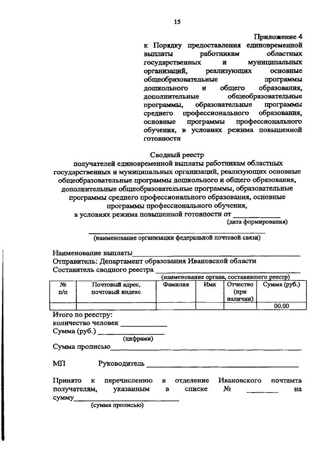 Постановление Правительства Ивановской области от 26.08.2021 N 394-п "Об установлении единовременной выплаты работникам областных государственных и муниципальных организаций, реализующих основные общеобразовательные программы дошкольного и общего образования, дополнительные общеобразовательные программы, образовательные программы среднего профессионального образования, основные программы профессионального обучения, в условиях режима повышенной готовности и о внесении изменений в постановление Правительства Ивановской области от 13.11.2013 N 450-п "Об утверждении государственной программы "Развитие образования Ивановской области" (вместе с "Порядком предоставления единовременной выплаты работникам областных государственных и муниципальных организаций, реализующих основные общеобразовательные программы дошкольного и общего образования, дополнительные общеобразовательные программы, образовательные программы среднего профессионального образования, основные программы профессионального обучения, в условиях режима повышенной готовности")