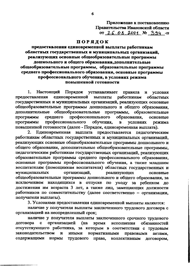 Постановление Правительства Ивановской области от 26.08.2021 N 394-п "Об установлении единовременной выплаты работникам областных государственных и муниципальных организаций, реализующих основные общеобразовательные программы дошкольного и общего образования, дополнительные общеобразовательные программы, образовательные программы среднего профессионального образования, основные программы профессионального обучения, в условиях режима повышенной готовности и о внесении изменений в постановление Правительства Ивановской области от 13.11.2013 N 450-п "Об утверждении государственной программы "Развитие образования Ивановской области" (вместе с "Порядком предоставления единовременной выплаты работникам областных государственных и муниципальных организаций, реализующих основные общеобразовательные программы дошкольного и общего образования, дополнительные общеобразовательные программы, образовательные программы среднего профессионального образования, основные программы профессионального обучения, в условиях режима повышенной готовности")